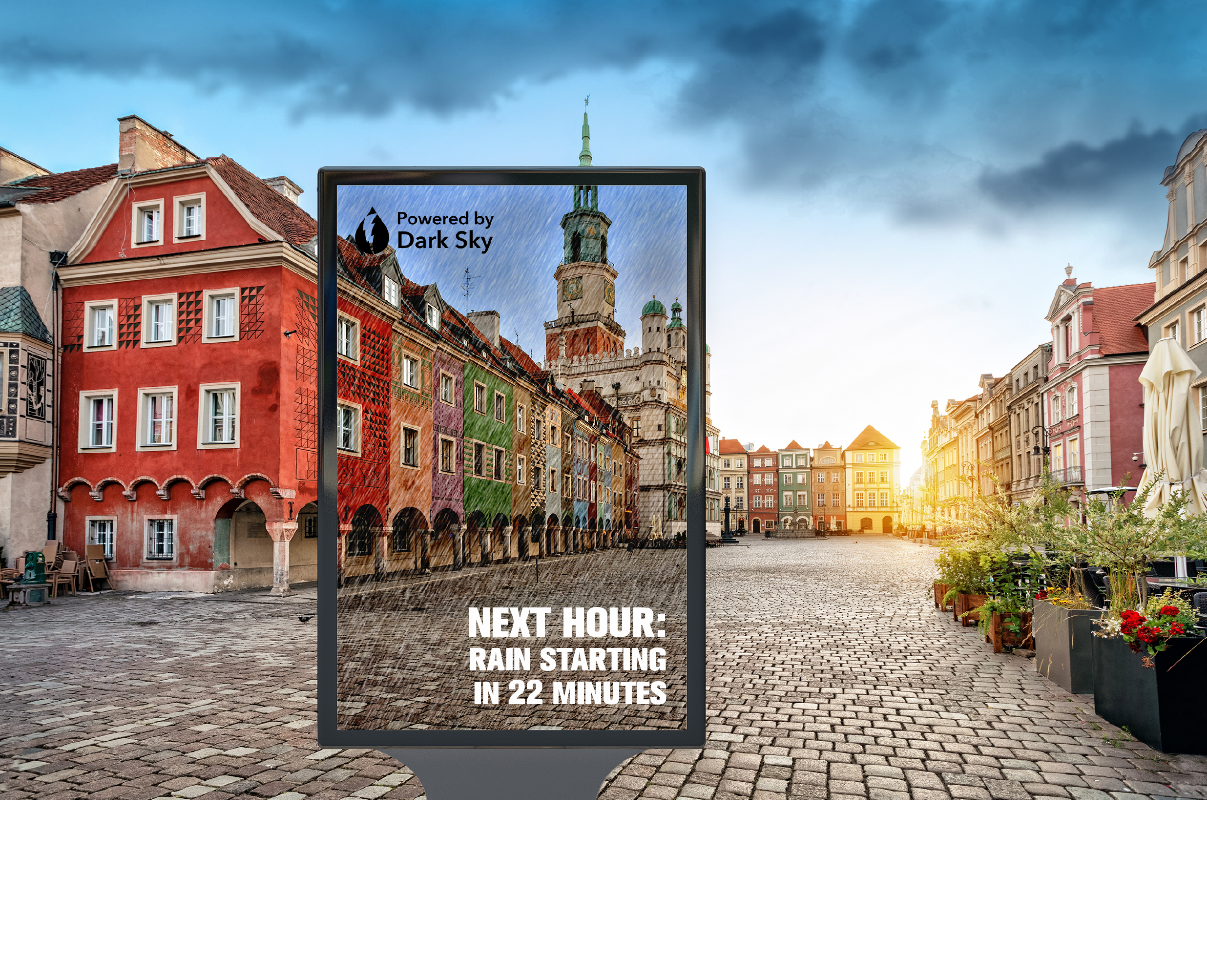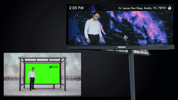 Select bus stops with green screens will transform into hyperlocal weather stations. Unsuspecting bystanders will be broadcast onto an LED billboard nearby with Dark Sky’s next hour forecast for that specific bus stop.